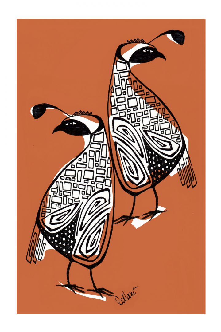 In this season of life, my art reflects many years of curiosity, and exploration. As a result, my art studio is multi-faceted, brimming with whimsical clay rabbit sculptures, hand carved painted wood trays painted with folk art, bold mid-century illustrations, and a variety of acrylics, mixed media paintings and color pencil drawings. Being a professional cartoonist, illustrator and graphic designer has enabled my never-ending need for variation. Over the years this intriguing fusion of methods adds to my figurative style of painting women, offering a thought provoking and sometimes quirky study. When I moved to Tucson, I became fascinated working in 3-D, and developed a series of paper maché/stone clay Jackrabbit sculptures. Each rabbit has such aa adorable face, that you can’t help but smile when you see them. My mixed media pieces are painted on beautiful hand-carved wood trays. The texture of the wood, paint and papers gives the final piece a rich and earthy feel. The latest collection I have been working on is a series of desert animals, hand illustrated in ink, with bold color added in Photoshop. These illustrations are my nod to the adoration I have for Mid-Century Modern art. Having grown up in Palm Springs in the 1960’s, this timeless contemporary style has given me an outlet to explore the incredible animals of the desert in a fashion that is new and fresh.