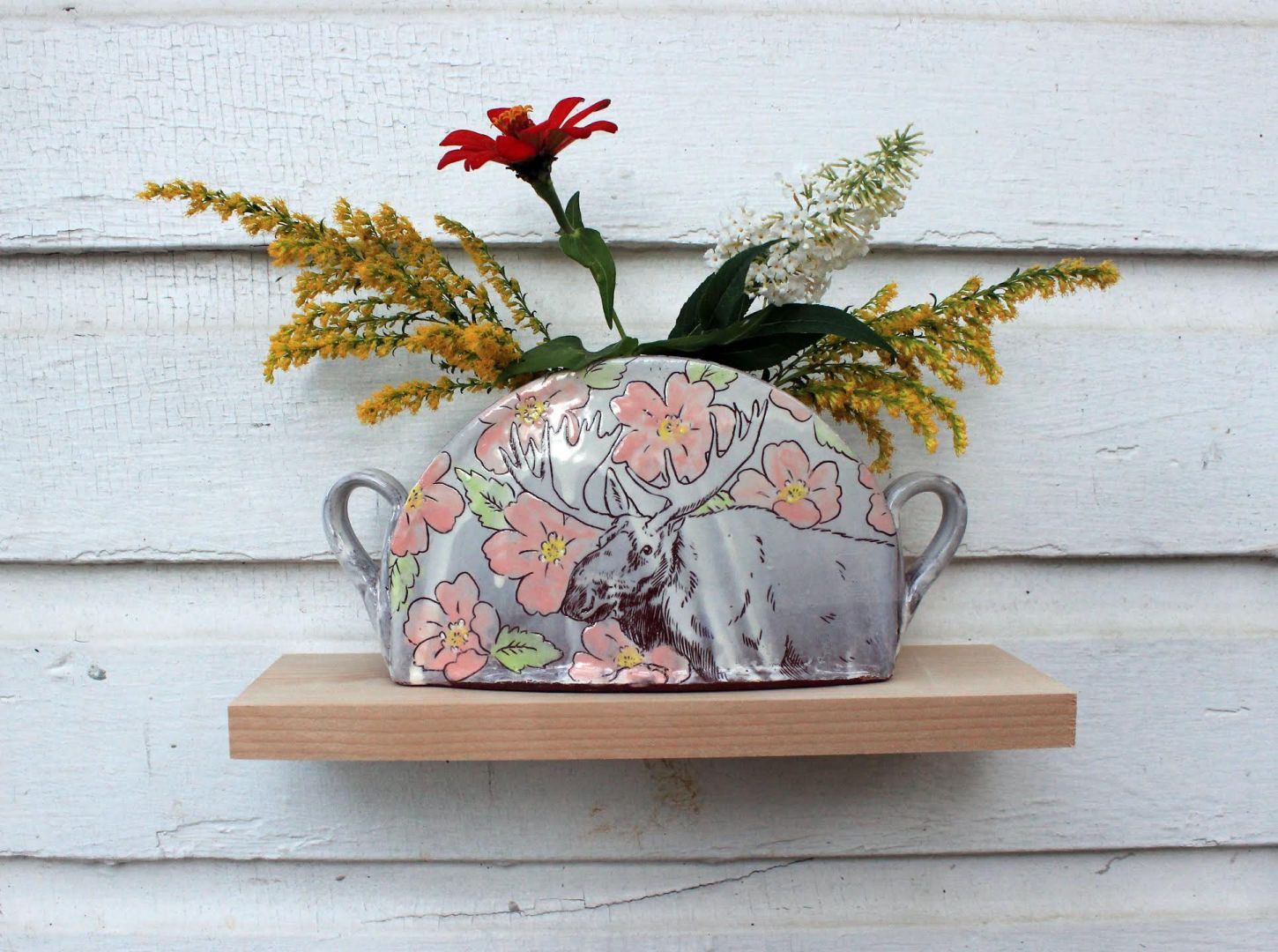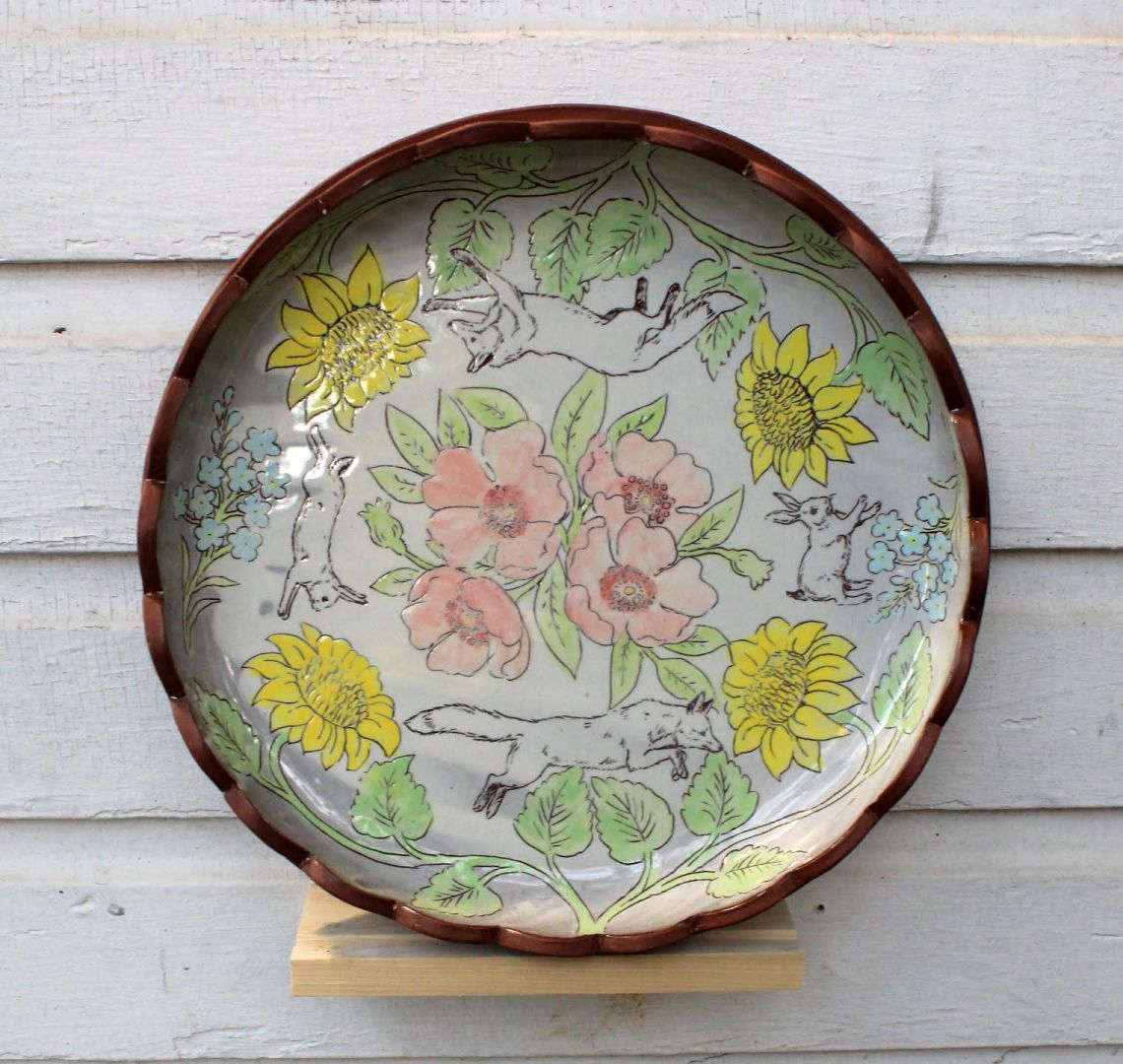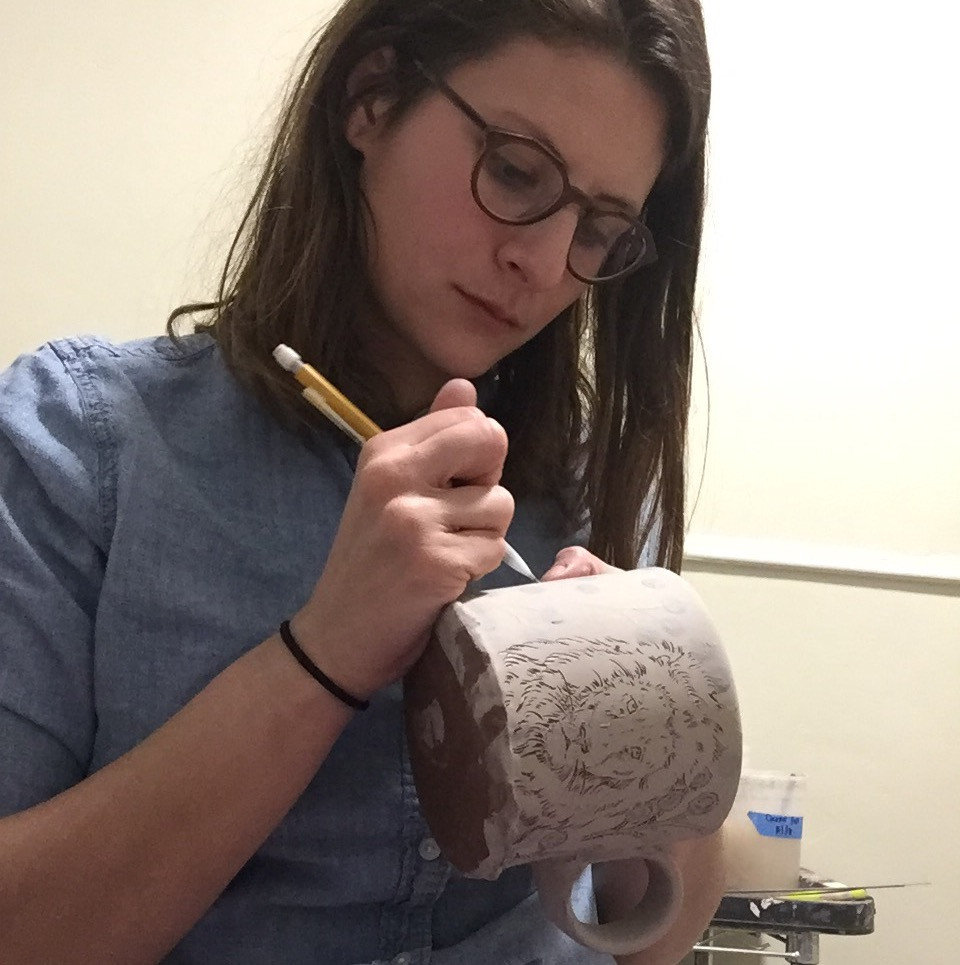 We started Sugar Jaws Pottery in 2016 as a summer side project that grew into a collaborative business. We both have practices in ceramic sculpture and the pottery gave us another creative outlet in the medium. It became a way for us to make some income which mostly gets fed back into our art making expenses. We called it Sugar Jaws Pottery after our rescue dog, Sugar Jaws. We did that jokingly claiming we could try to write off our dog’s vet bills since he was the mascot; that didn’t work, but the name stuck. Sharing the process has allowed us to rely on each other’s critical eye, take advantage of our individual strengths, and to share in the work. Early on we began using animal imagery to draw people in. Humans often have a special relationship with particular animals; a chance encounter with a wild creature, a beloved pet, or a common pest that pulls at our hearts can make a pot special to an individual. The florals/patterns are often sourced from victorian era fabric, illustration, and print.