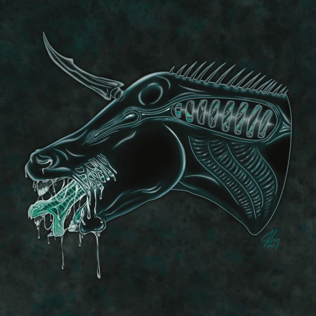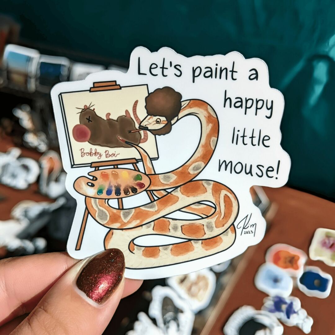 Lately I’ve been really into digital art, one of the pictures in this article is of a recent digital art commission of a Xenomorph Horse for a friend. I also have a picture of a sticker design of my personal corn snake Bob Ross aka Bobby Boi as his namesake. I really enjoy fun concepts that are out of my normal range of artwork. I love how my art has changed over the years as I pivot into different things like sticker design and even website design, I am proud of my ability to adapt and grow. Making my own stickers in house was a huge learning curve but I love the opportunities it’s provided. I’m able to do small batches of stickers and offer pet portrait stickers for people. A lot of sticker printing businesses online have minimum order requirements of 50 stickers and that can be frustrating when you just need a couple.
