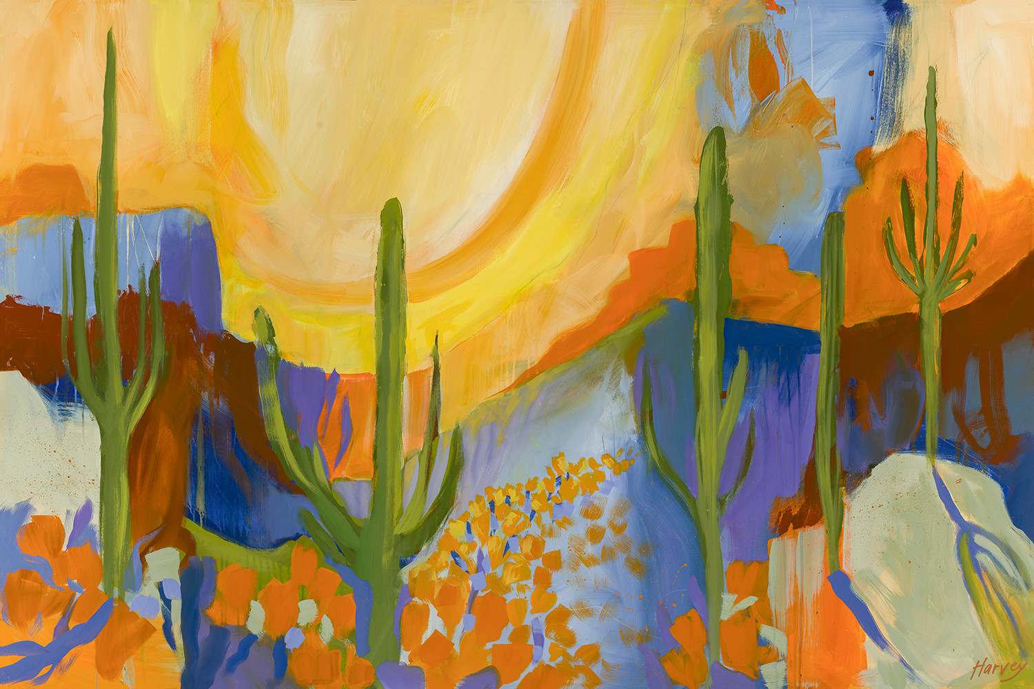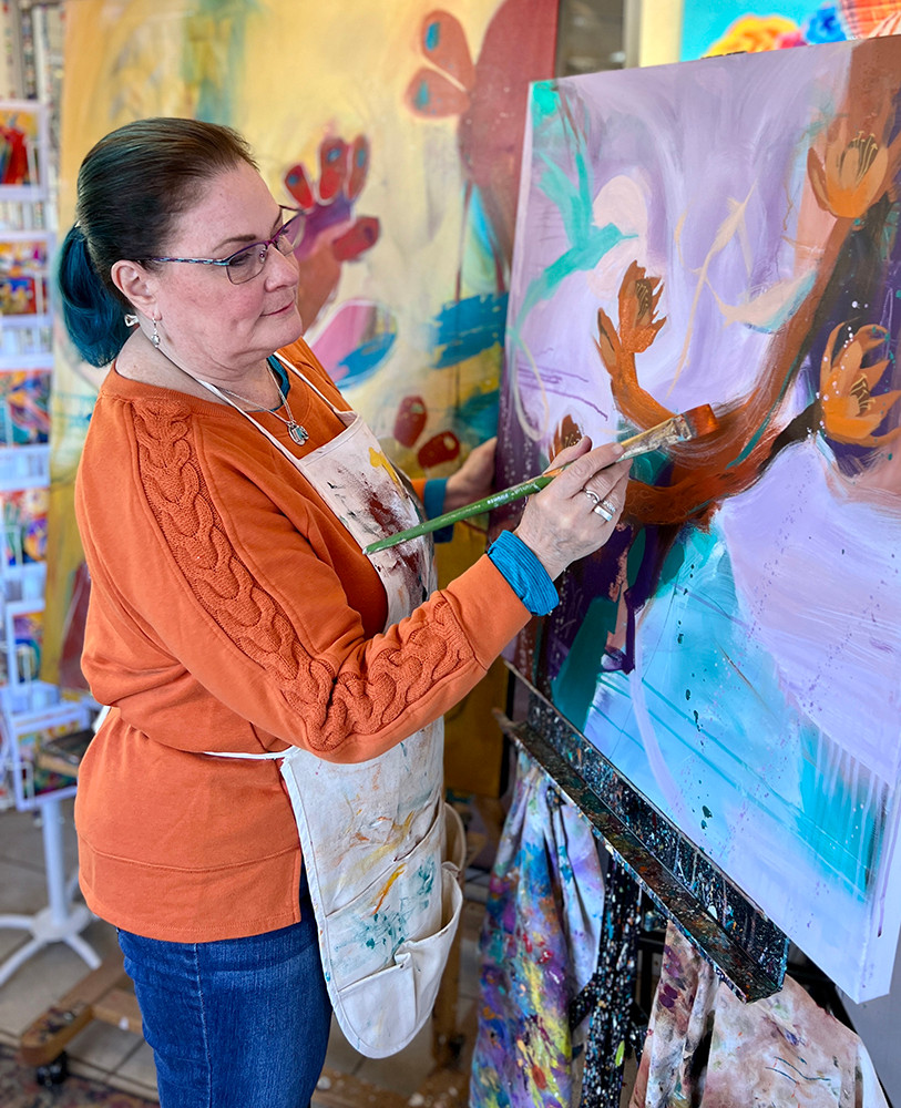 I’m an intuitive painter creating colorful, bold, semi-abstract art inspired by my southwestern surroundings. I have been creating since I was a young child drawing on the wall-sized chalk board my father installed in my room. I studied illustration in school and had a successful design career in Tech for over 25 years. In my corporate positions I designed video games, websites, mobile apps and complex back-ends for software and apps. Along the way I was consistent in creating with varied traditional mediums, but painting has always been where my passion lies. I began showing my paintings in local farmers and crafts markets over 10 years ago and remain an independent artist. In 2022 I left the corporate world and now paint full time. Recently, I have ventured into the gallery world and have some great opportunities to see how that works for my art before any commitments are made. As an independent artist I sell my work through my website and through social media leads along with gallery consignments.
