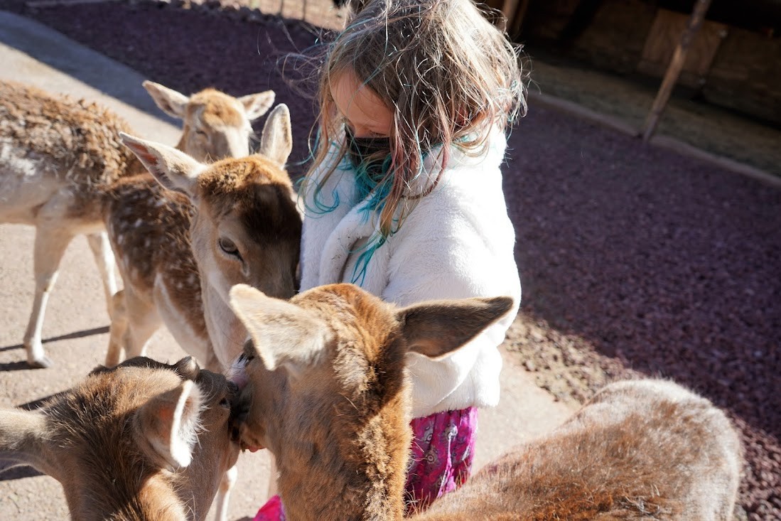 We spent a week in Williams Arizona it was our families favorite trip so far! If you haven’t already you absolutely must see the Grand Canyon. It is one of the most wheelchair friendly National Parks we have been to. One full day is sufficient here if you are hitting all of the roadside stops and walking the wheelchair friendly paths. We stayed at Raptor Ranch and if you are looking for some Flinstone nostalgia this is the place for you! Our 9 year old daughter loved running in and out of the different houses and going down their big dinosaur slide. They also have a great show and fly the Raptors and feed them, very educational for a homeschool family. Another family friendly spot you can not miss is Bearizona. This isn’t just any zoo, you drive through exhibits and bears, wolves, bison etc walk right next to your vehicle. This feature also made it perfectly accessible for anyone who can ride in a vehicle! This might have been the highlight of our trip until we stumbled upon The Grand Canyon Deer Farm. Our daughter is still begging to go back. More deer than you can count will follow you around to eat from a cup of food in your hands. You can pet them and honestly they are a riot along with the other animals they house, We are a homeschool family so hands on experiences, zoos etc are wonderful but we have a spot in our hearts for National Monuments. We made a day of visiting Tuzigoot National Monument and Montezuma Castle National Monument. If you are in the area and like history these are great places to see, Montezuma Castle is completely wheelchair and pet friendly. It’s not a lot of walking and we learned so much about ancient cliff dwelling life in about an hour. Tuzigoot is visually even more impressive, you can walk on sidewalks up to the ruins, it is a bit steep but we did just fine pushing our sons wheelchair here as well. You can really immerse yourself in the history here and for us the homeschool experience couldn’t be beat. We spent the next two days seeing Walnut Canyon National Monument, again great history here, and then we knocked a bucket list item off. Incase you didn’t know Sunset Crater National Monument is the home of a volcano! Seeing the volcanic rock and fields was truly an experience and a great lesson for the road! Down the same road is Wupatki National Monument which is more ancient ruins, more history and has a great wheelchair friendly viewing trail. Our week in this area of Arizona truly couldn’t be beat and I hope more travelers discover these gems!