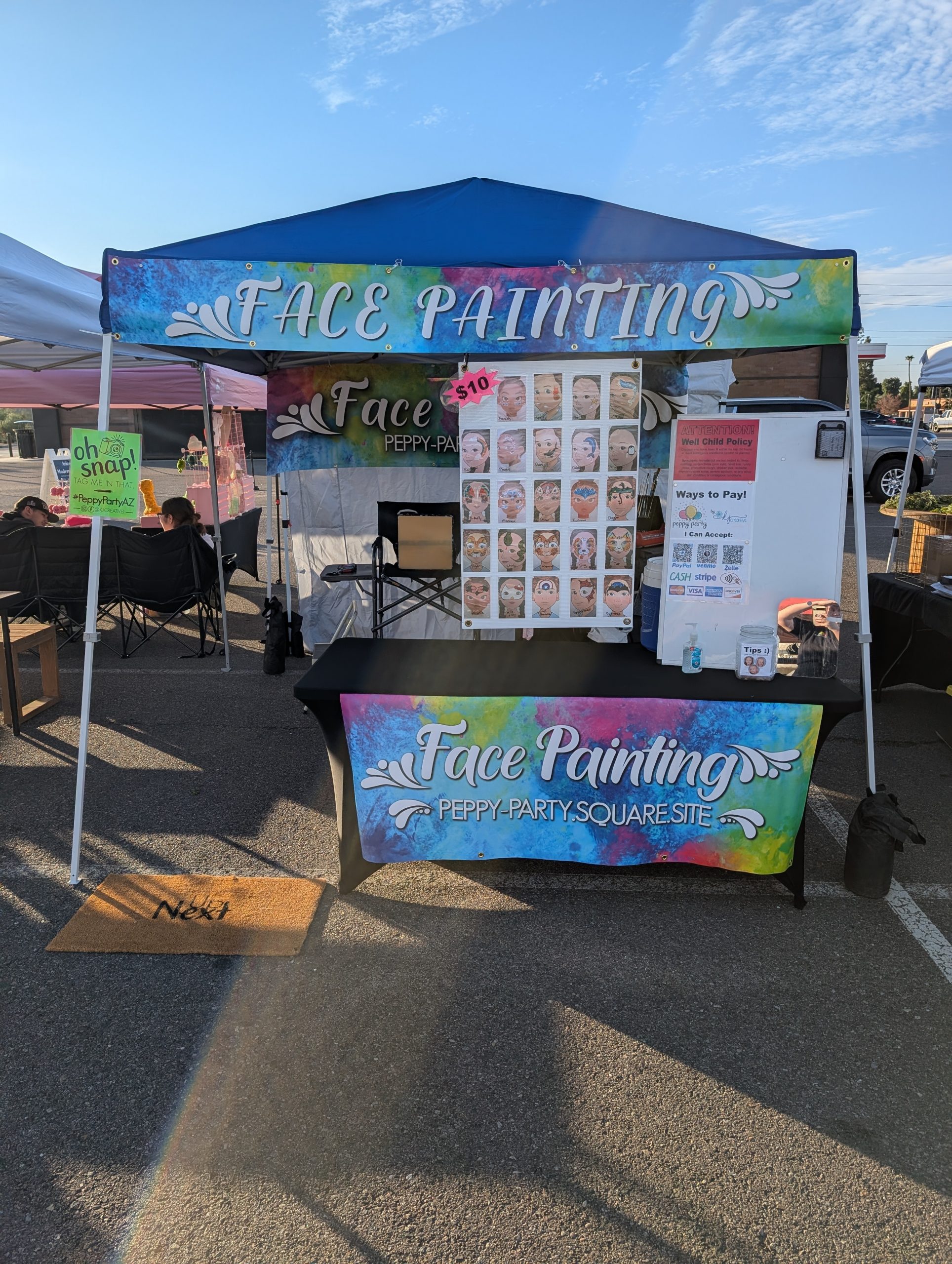 Peppy Party started when my cousin came to me with an idea for a mobile petting zoo. She is amazing with animals, but she needed a “people person” and so we decided to partner up. Although helping here was great I felt like I needed to offer more than just being friendly. I quickly decided to pick up my paint brushes and begin face painting. I briefly did some face painting in high school and new that I could quickly pick it up again. In my research I found that balloon twisting was an excellent accompaniment to face painting. I decided to teach myself how to do it. As it turns out I have a bit of a natural affinity for twisting balloons and painting faces! I had no idea if there was any need for such a thing in my community or how it would be received. After creating my logo and website (using my design background) I launched my business on social media, and it took off! There has been such a need for my services and people love my results. It has been a huge learning experience but has been so much fun!