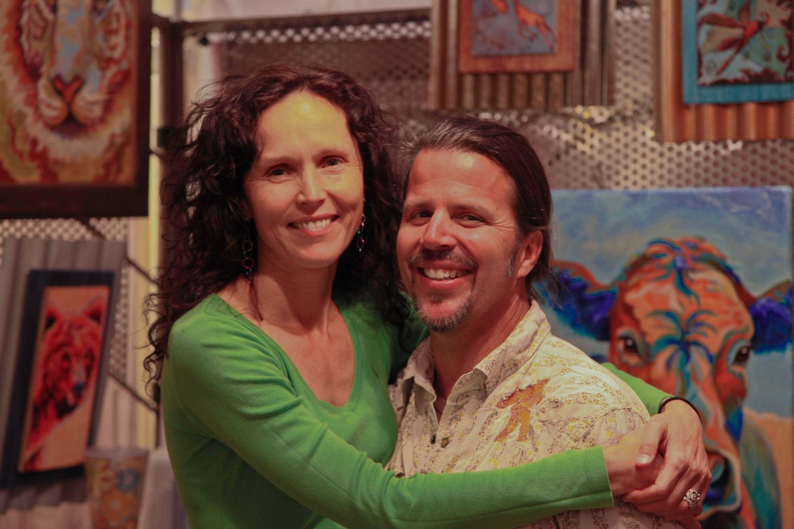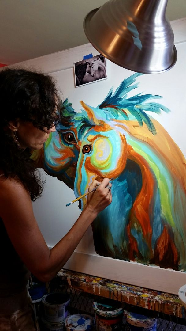 My biggest message with my art is HEAL OUR PLANET. I feel our highest goal as a human being is helping the human race survive which means helping the planet thrive and continue to be home. I love Earth and all its’ creatures so much. One juicy benefit of my flavor of my art is that it inspires people to look at everyday items in a new light. I thought “why not push transforming things further and spread how I feel about the planet into my business?” I already drive a Prius, recycle, compost, we have a solar hot water heater, I love hiking in nature, and love animals. So it’s time to take this into my artwork. I have a deep connection to the Earth and care about what happens to it. Inspiring people to think about their choices and the Earth and to reuse things more often is my desire. I thought, what could I use that would be reclaimed to paint on? At that same moment my husband’s family was working on a historical remodel and had lots of tin roof to dispose of. I went to them and asked if they had anything they thought I could paint on. They pointed to a huge pile of tin and everything slowly fell into place. I started playing around and loved it; it felt so much better than just using canvas. Now it’s a hunt that never ends. I love transforming things, including minds. Combine this love with a classic painting degree and fast forward 30 years. My paintings now focus on healing with a strong the connection to flora and fauna. My color palette is a crowd pleaser. I use all jewel tones and deep rich greens and pull blues from the ocean and sky. They are all high vibrational energy received in a package of visual delight with an immediate connection to wildlife and nature. My work is a joy boost, therapy without a sofa. Well, usually the sofa is below my where my art is hanging : ) The materials I use, the palette I choose and my subject matter all line up to create a magical world where the connection to our planet and animals come alive. I am a light in this world and I choose to reach the biggest audience through my paintings. I am thrilled to be that girl in the world.