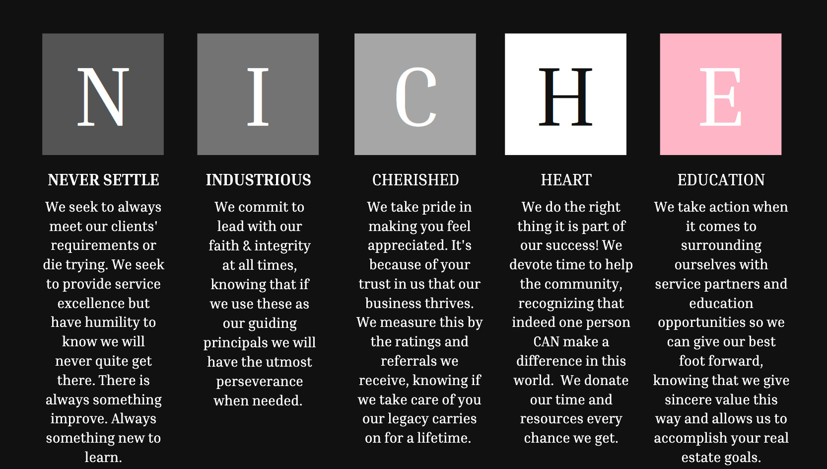 I own Niche Home Team based out of Arizona and next year we will be in Texas (where I am originally from). We are a full service real estate team that does everything opposite of what the “real estate world” tells us to do. On purpose we make sure that all we do will leave a legacy. For over a decade I tried leaving real estate because it can be a peaks and valley type industry (we are 100% commission). However, a little over a year ago I quit a six figure job to pursue what I knew I was supposed to do: real estate. I literally went from six figures to ZERO $ and I have not looked back since. I knew that in order for amazing things to happen I needed to make room for bold faith. Now don’t get me wrong, I did not leave the job because I wanted to. I left because the company vision changed and my heart was no longer in it. I swore from that moment on that I would never work for someone that did not have my same values. So I became a full time Momprenuer and got my God-given purpose trademarked. Outside of my family this is the one thing I am most proud of. I own and operate a company that has the slogan: A Faith Driven, People Inspired Company. HOW POWERFUL IS THAT?! If someone doesn’t like it, then it means we will not share the same value and mission from the get go. My team would not be the right fit, but we are happy to refer to someone that would be. Niche Home Team isn’t looking to be the #1 team in Arizona or the world. We are seeking to make the difference in one person’s life, knowing that if we stay the course with this philosophy we will help make the world a better place.