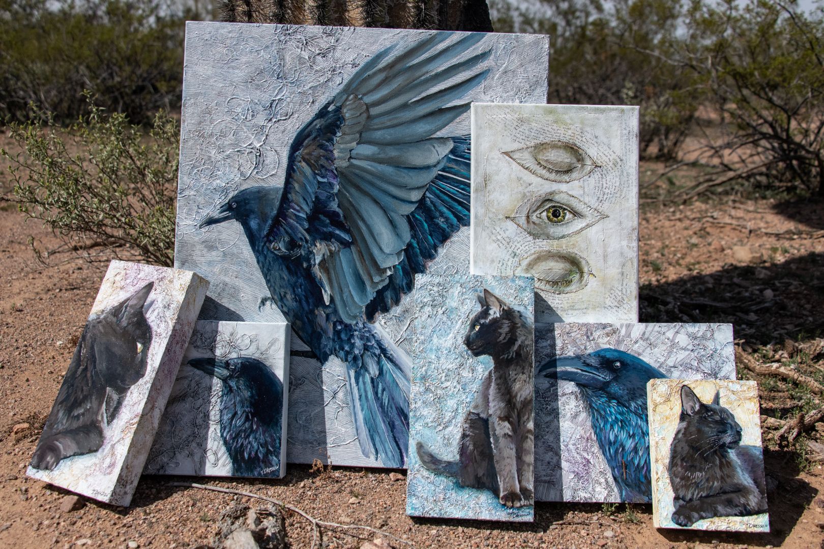 I switch between media, I am focused mainly on acrylic painting and digital photography. Each practice informs the other. The main intent of the photography is to collect my own source images to work from, but they often stand on their own. I collect textures both photographically and physically. I like to build unique textures in my paintings utilizing found ephemera, string and fabrics. Symbolism is an important subject in my work as well.
