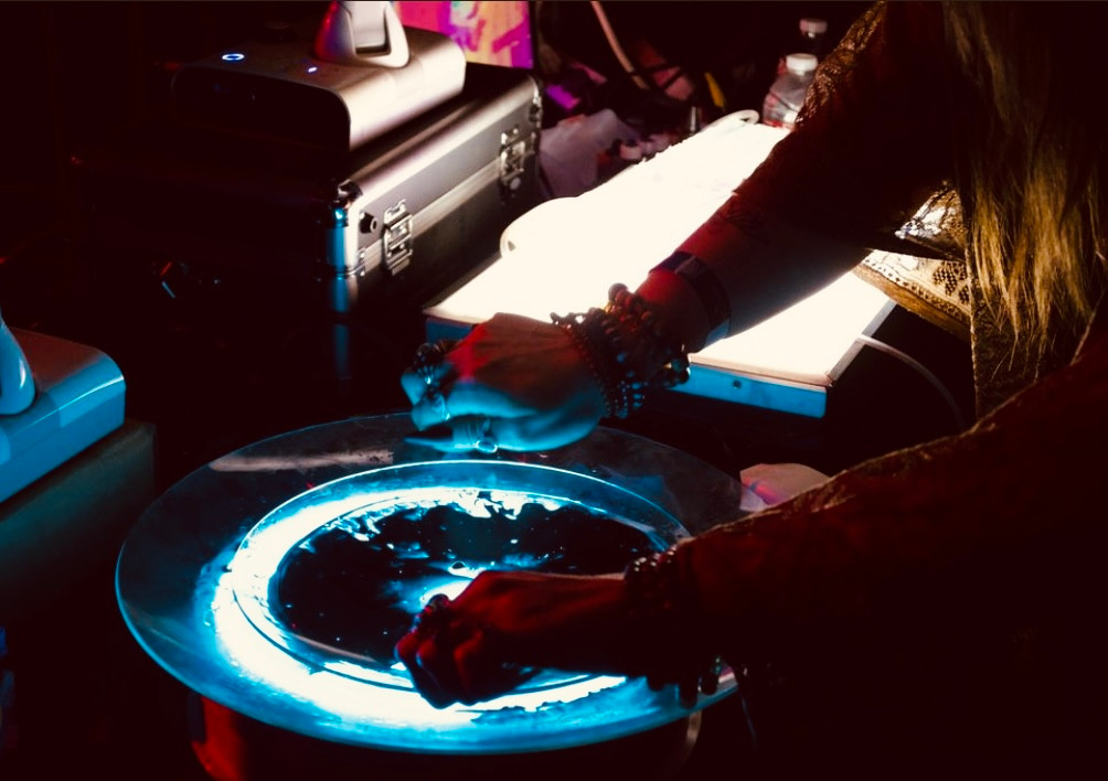 I am a lights/visual artist that started out with liquid light projection, an art form that was used heavily in the 60s and 70s psychedelic music scene. My first setup consisted of an old overhead projector, two plates, and some liquids and dyes. I was pretty insistent on sticking to the analog methods they used back then, until I felt I had reached a limit in what I could do with it. Then began the perpetual evolution of my gear setup and techniques that continues to this day. Since then, I have incorporated cameras, mixers, crt tvs, vhs tapes, and other pieces of equipment that allow me to achieve a wider variety of styles. The one constant that remains throughout all the changes is my love for liquid light. I am determined to utilize that art form no matter what my process looks like at the time, it is something I take pride in. The biggest lesson I’ve learned along the way is improvisation and adaptability. Every venue is different and finding the most effective way to set up is often a challenge. I also perform alongside bands in a wide range of genres. Even the bands I work with frequently have different sets each time. I have learned how to synchronize my visuals with their music in a live setting and that is something which brings me joy and fulfillment. It means that each set you come out to see from these incredible local musicians is a unique experience. I think that also translated into an important lesson in life for me; learning to be fluid like the liquids and go with the flow, adapting in each moment based on what waves life throws your way.