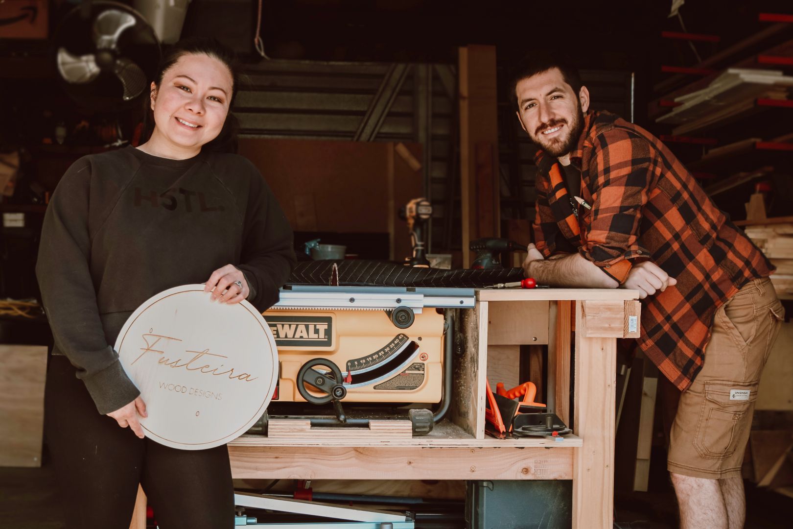 Aside from music, I have always been fascinated with making wooden pieces for the house or music studio in my spare time. I started posting some of the stuff I made on social media, and got some positive feedback. Throughout all my builds, Gill would always help me out or give me ideas with the designs. From there, we started thinking about the idea of opening our own small woodworking business. Due to lack of time we kept putting it off. Then the pandemic happened! We found ourselves with a lot of free time and decided to bring our idea to life. We packed all our stuff, moved three hours north of Los Angeles to a small town called Tulare, and set up our small wood shop. That’s how Fusteira was born; a small family based business that strives to bring people together with well thought out designs and personalized wooden pieces.